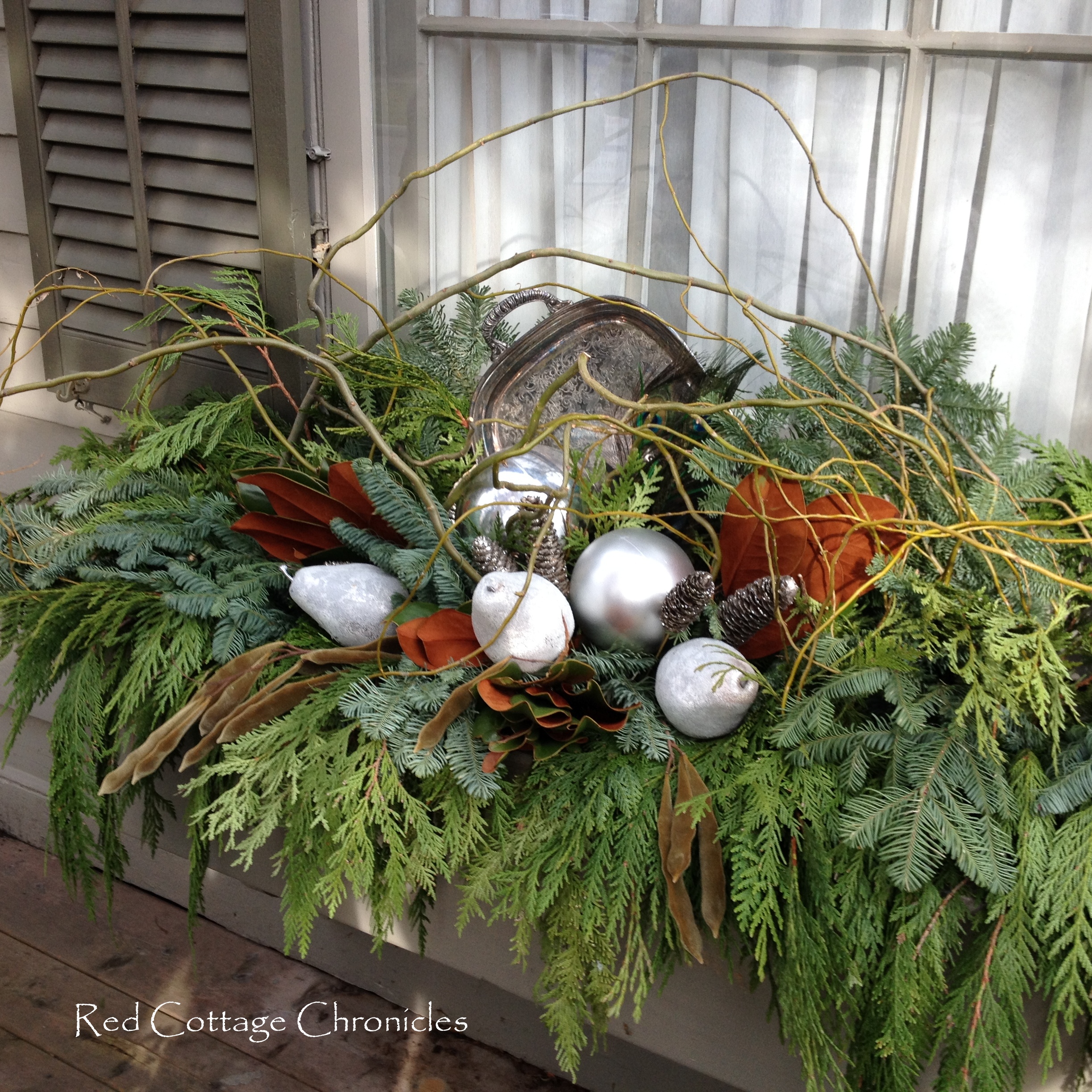 How I wish I could have snapped some pics of the inside of this home.ย It is the tiniest little home from the street, but with a huge addition on the back.ย The fireplace was massive, all flanked with white built-in bookcases lined with the owners collection of red crystal.ย There must have been 100 pieces of this crystal that started red at the base and faded to rose and then finally clear crystal at the top.ย Everything from huge bowls to footed cake stands.ย It was so simple yetย spectacular.ย Old silver serving pieces were used in the greenery throughout the outside.ย You can see the silver tray peaking out the top of this window box.