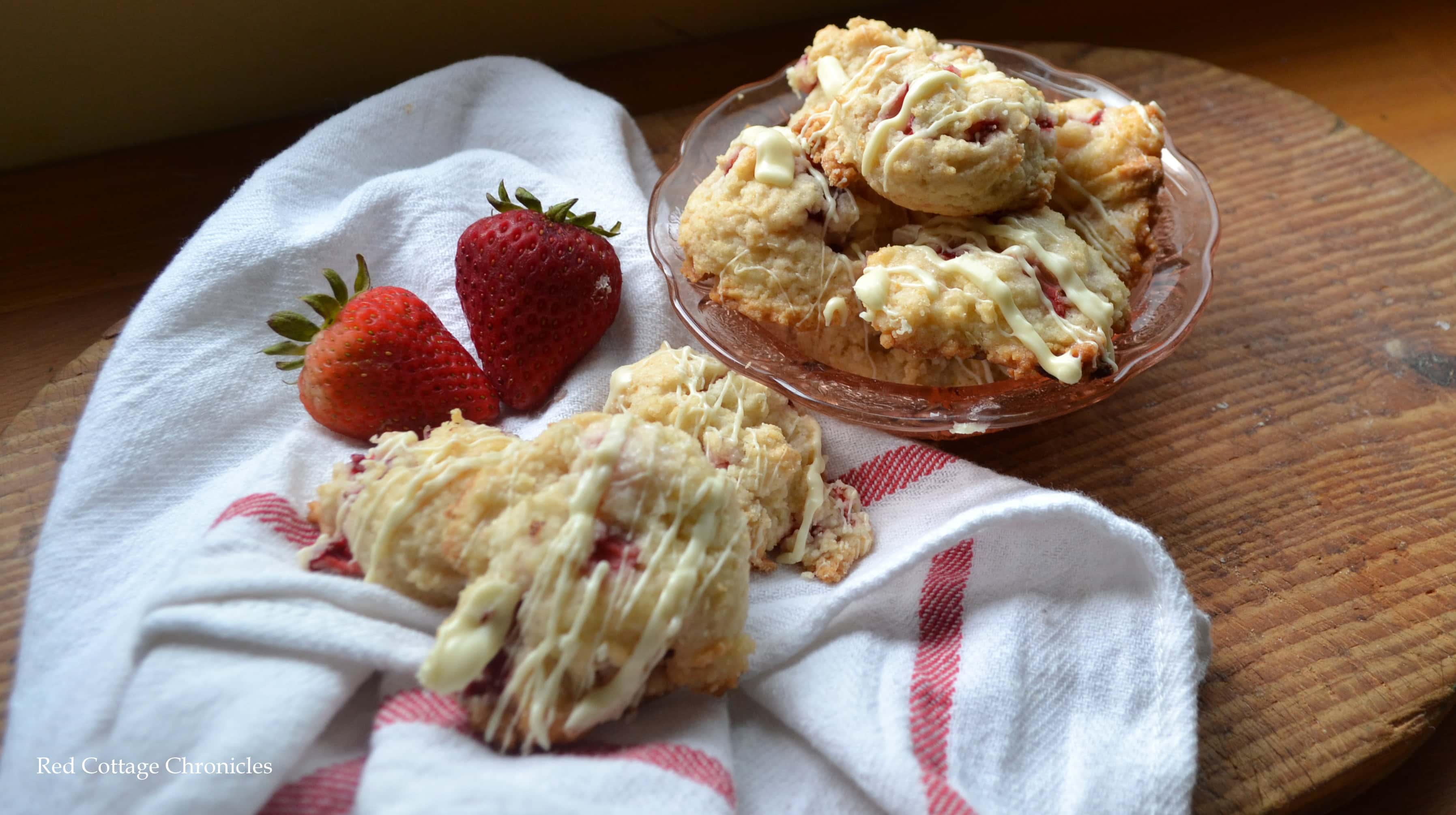 Gently fold strawberries and 3 ounces finally chopped Belgian white chocolate into the batter. Do not over mix to prevent strawberries from becoming soft and mushy. Drop by tablespoon fulls onto parchment lined baking sheets. I use by trusty tablespoon size scoop. Bake at 375 degrees for 15 to 20 minutes. Remove to wire rack to cool.